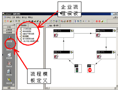 在Javelin的"系統(tǒng)管理"工具條中有一個(gè)流程模板定義入口,在這里你可以創(chuàng)建企業(yè)的各種各樣的流程模板,見下圖所示: