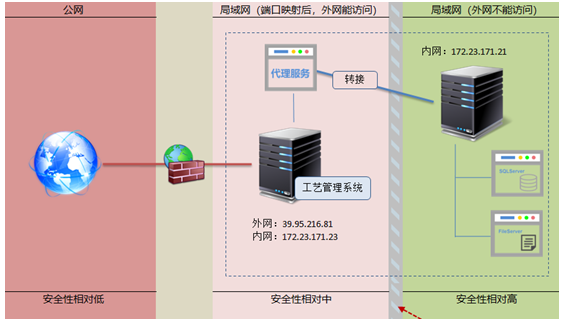產(chǎn)品生產(chǎn)加工工藝展示系統(tǒng)的APP獨(dú)立一臺(tái)服務(wù)器,這個(gè)服務(wù)器能被外網(wǎng)訪問(wèn)。系統(tǒng)訪問(wèn)的數(shù)據(jù)庫(kù)及工藝文件在另外一臺(tái)服務(wù)器,而這個(gè)服務(wù)器是不提供外網(wǎng)訪問(wèn)的。