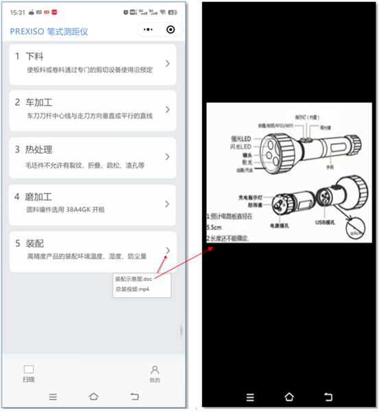 掃描二維碼,后顯示下圖,能查看當(dāng)前產(chǎn)品的工藝步驟,點(diǎn)擊某工藝步驟后 ,查看針對(duì)的工藝文件