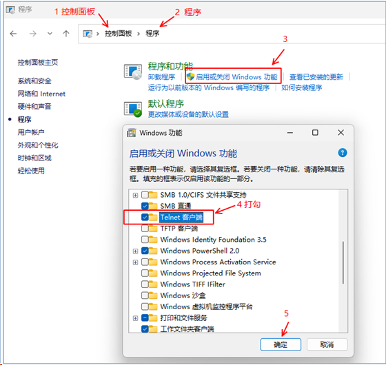 需要配置一下。在“控制面板”-》中選擇“程序和功能”,在“程序和功能”-》中選擇“打開或關(guān)閉Windows功能”。在彈出的“windows功能”窗口中將Telnet服務(wù)器和Telnet客戶端勾選并保存設(shè)置