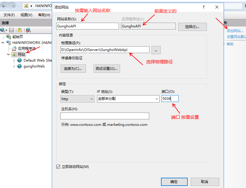 5、在 IIS 管理器中創(chuàng)建一個新的網(wǎng)站或?qū)?yīng)用程序發(fā)布到現(xiàn)有的物理路徑。