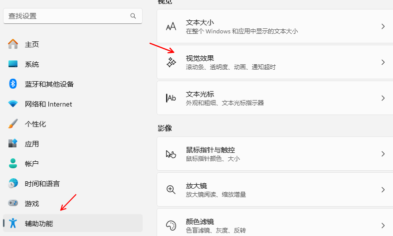 左側(cè)菜單選擇“輔助功能”,右側(cè)選項(xiàng)中找到“視覺(jué)效果”,通過(guò)關(guān)閉透明效果和動(dòng)畫(huà)效果,你可以減少系統(tǒng)的視覺(jué)負(fù)擔(dān),提高電腦的響應(yīng)速度和流暢度。